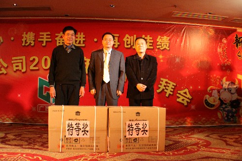 春節(jié)團(tuán)拜會(huì)上公司董事長黃鼎龍(中)給抽中特等獎(jiǎng)的員工發(fā)獎(jiǎng)并合影留念
